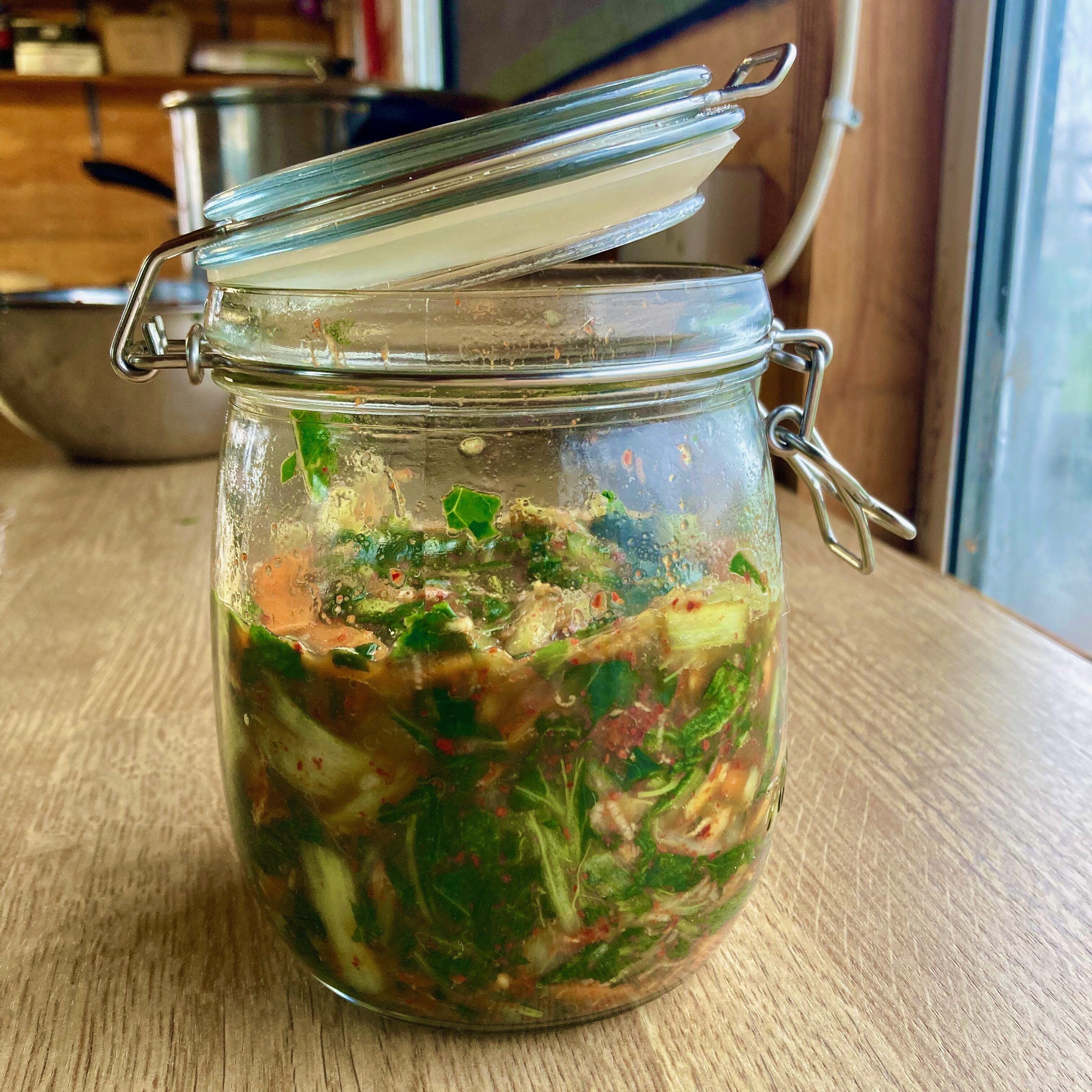 Transfer the mixture into a sterilised glass jar and make sure to press down the veg so that all of it is submerged in the liquid. Make sure to leave at least a 4cm gap at the top of the jar for the kimchi to expand.